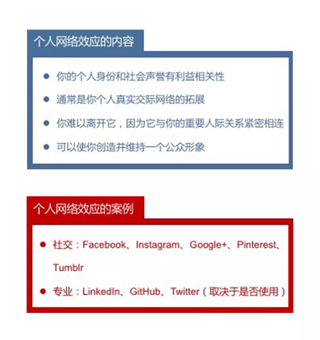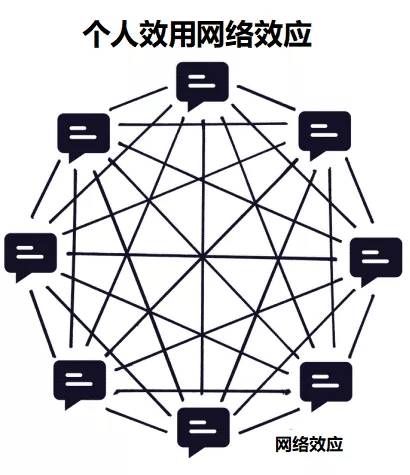 个人网络效应与个人身份及名誉紧密相关,人们能够相互沟通交流。每个节点对于其他节点来说都是内容生产者,也是每个人可能认识的潜在的对象。