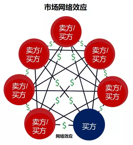 市场网络将个人网络中的身份和联系,结合市场网络的交易热点与目的。通常情况下,市场网络首先要加强线下的专业人士网络。我们认为市场网络是一种直接的网络效应,因为不同节点之间的关系是直接的,如下所示: