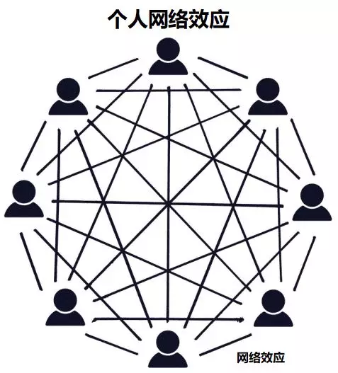 个人网络效应来自于与其他人建立联系的需求。正是这种冲动驱使人们加入并坚持使用社交网络(例如Facebook、LinkedIn或者宗教),因为他们的朋友/同事以及邻居都在这个社交网络中,个人网络中的社交图谱通常与他们的现实关系密切相关。