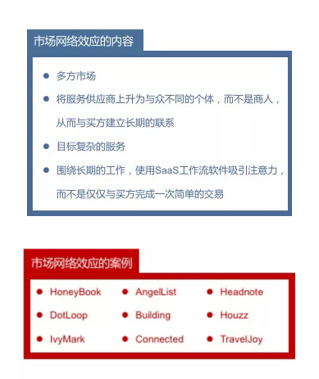 市场网络与双向市场存在显著的区别,尽管两者经常被混淆。大多数人认为像HoneyBook(注:一家初创科技活动创意公司,通过重新设想创意,帮助顾客简化各类活动流程)和Houzz(注:互联网家装平台,集合了设计师社区、内容发现以及电商的大平台)这样的公司是交易市场,但事实并非如此。