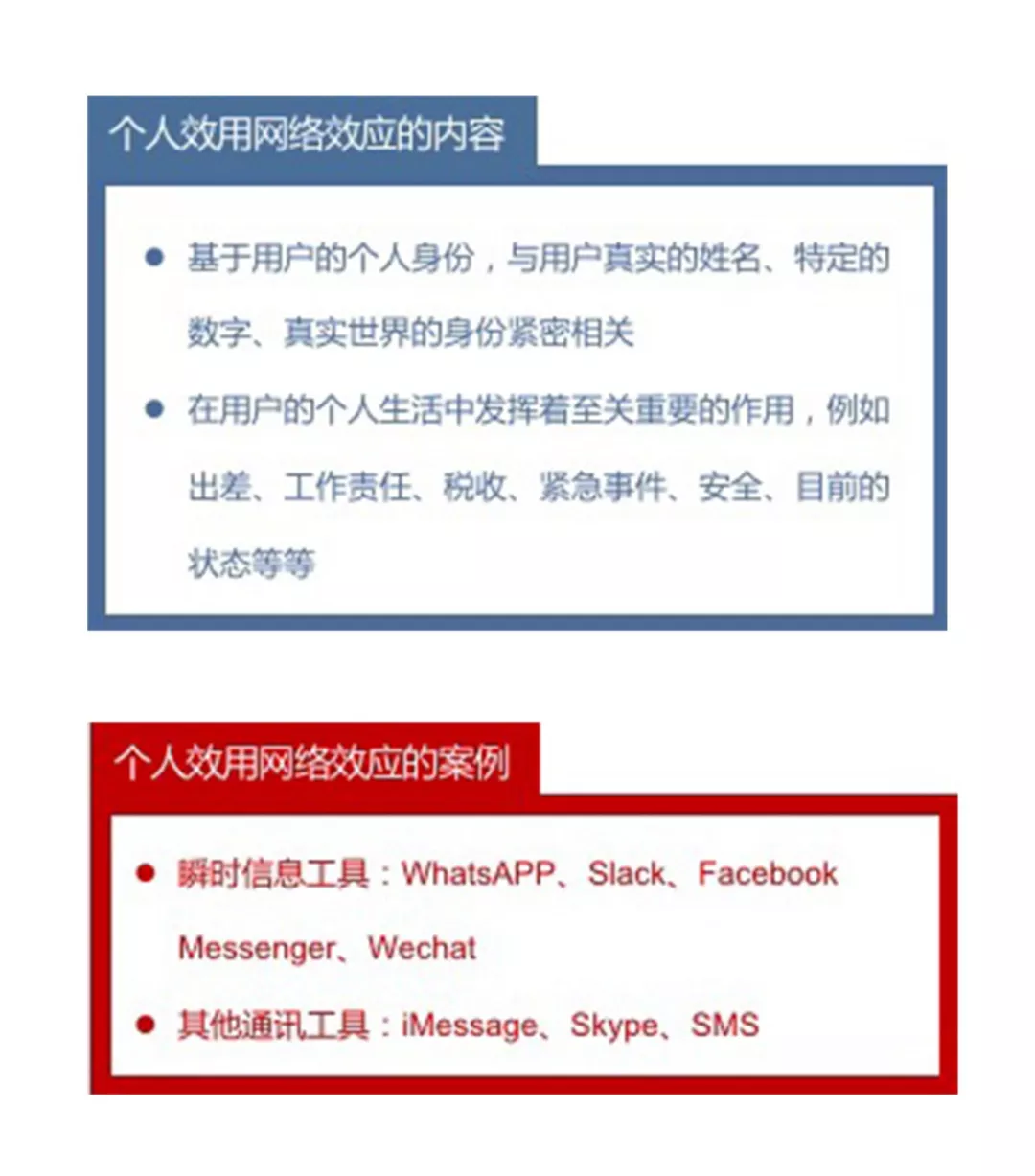 个人效用网络有两个显著的特点。首先,用户的个人身份与所使用的的网络之间存在紧密的联系,通常网络中的用户名与他们的真实姓名相关联,就像Facebook Messenger一样;其次,个人效用网络对用户日常的个人或职业生活至关重要。