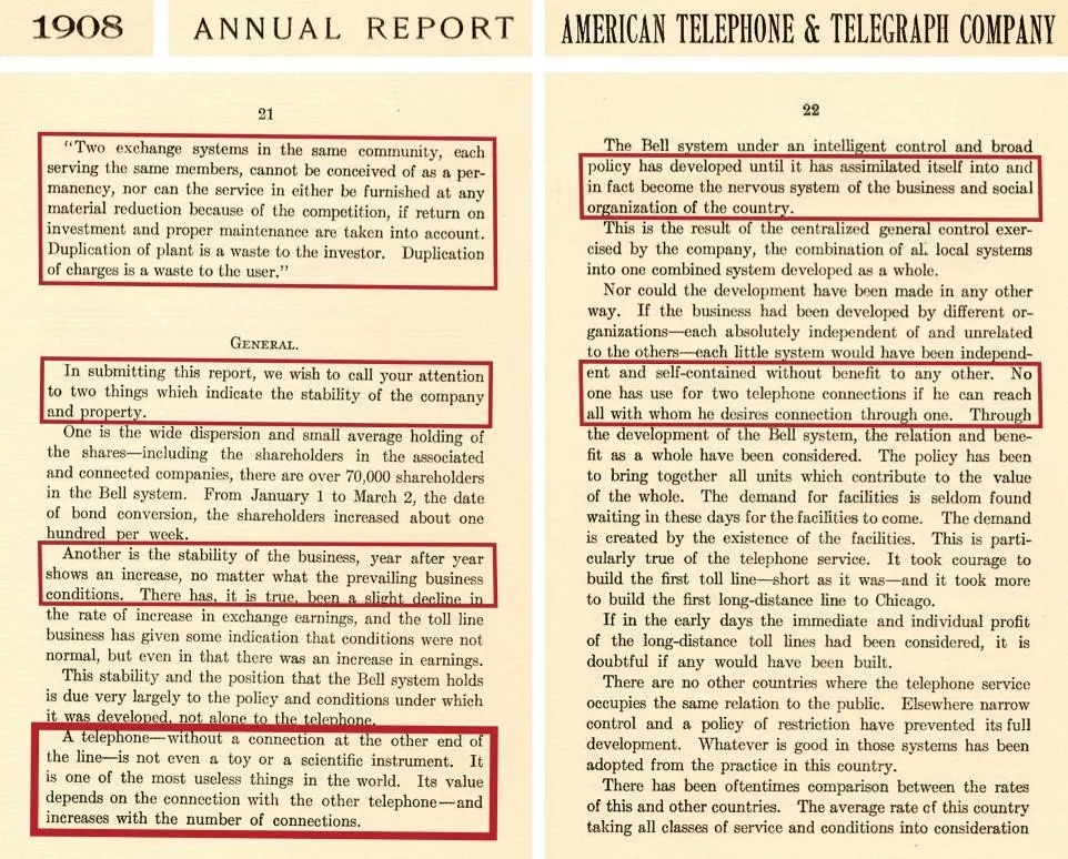以下是韦尔1908年年度报告的的全文。韦尔描述过“网络效应”这种概念,但是他并没有直接使用过这个词(这个词本身出现的时间还要晚一些)。