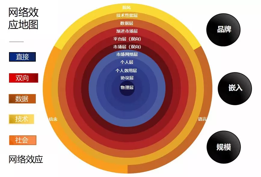 在下图中,描述了各种网络效应的类型和类别,最强大和最简单的网络效应因素处于地图的中心。图的右侧也显示了另外三种影响发展的因素。