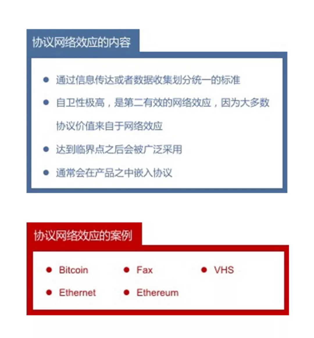 当通信或计算标准公布于众之后,所有节点和节点创建者可以使用该协议接入网络时,协议网络效应就产生了。比特币和以太币就是最新的例子,协议设置者可以是单个公司、一群公司或一个专门的小组。