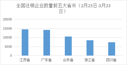 企查查数据显示,在过去一个月(2月23日-3月23日),全国范围内已有12万7千家企业登记注销。不过,注销数量最多的其实并非湖北,而是江苏省排名第一,14661家;注销量超过1万的还有广东省14322家、山东省10682家。随后的是浙江省和四川省,分别有8630家和7391家企业注销。相对而言,疫情重灾区的湖北,仅仅只有114家。