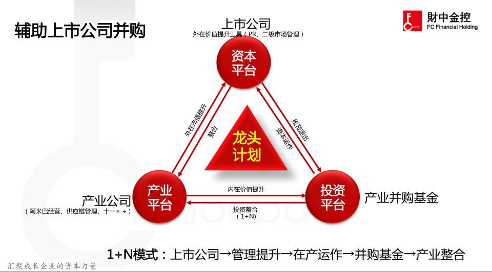 财中金控龙头计划,辅导上市公司进行并购,产业并购是产业发展的必然趋势。上市公司也有自身的痛点:缺乏人才,缺乏管理能力,缺乏系统,市值不高,盈利能力不强,并购能力不强等。提升上市公司的管理能力,通过整合行业上下游,运用收购与兼并综合手段,结合并购基金的投资平台及资本工具来改造企业,提高企业核心竞争力,打造产业龙头,提升上市公司的资本市值。