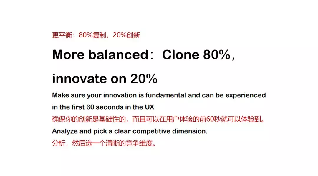 在已有的市场和新的市场之间,在中间选择一点。构建一些用户可以理解的产品,但是引入可以让你玩转市场的新奇创意。