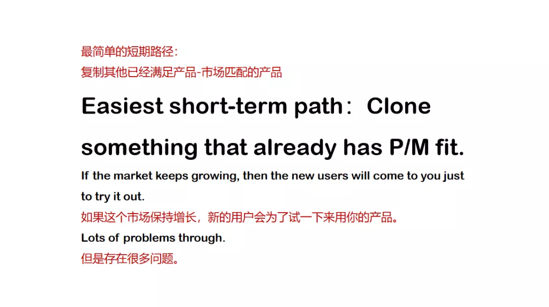 正如我们讨论咖啡杯时候一样,一个达到产品-市场匹配快速的方法就是复制一些东西。然而通过这种方法还是有很多问题,如果你是这个产品的第二个玩家,你会一直是第二个。你的团队会讨厌这种策略。投资者也不会选择你。有的时候市场足够大,那就可以做这样的事情,但这种情况并不常见。