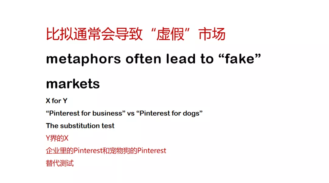 例如:“给宠物狗的Pinterest”还有“给企业用的Pinterest”都是这种类型的想法,但是狗只是Pinterest的一部分。正如我们说过的,在已存在的市场上找到切入点是关键。