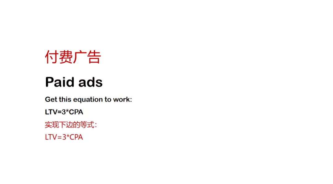 对于支付广告渠道来说,你最终要关注的是LTV (客户生命周期总价值)和CAC (用户获取成本)的问题。