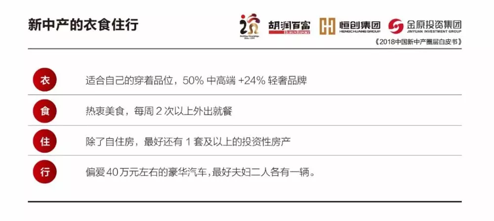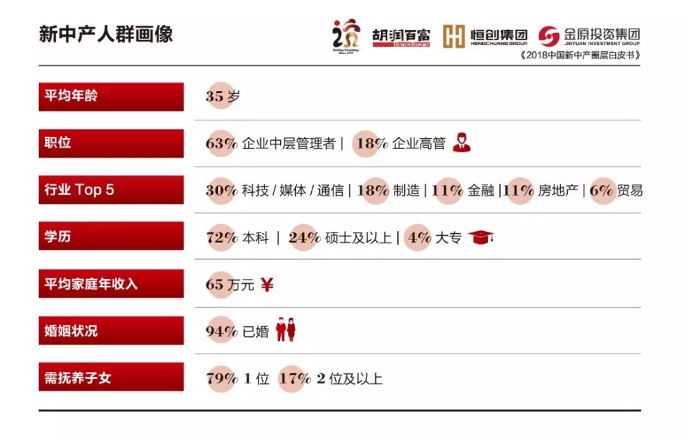 2018年11月23日,胡润研究院携手投资和资产管理公司金原投资集团,联合发布《2018中国新中产圈层白皮书》(China New Middle Class Report 2018)。这份36页的专业报告揭示了中国中产阶层和新中产圈层的规模、特点和需求,描绘了他们的生活状态、情感现状和财富观。