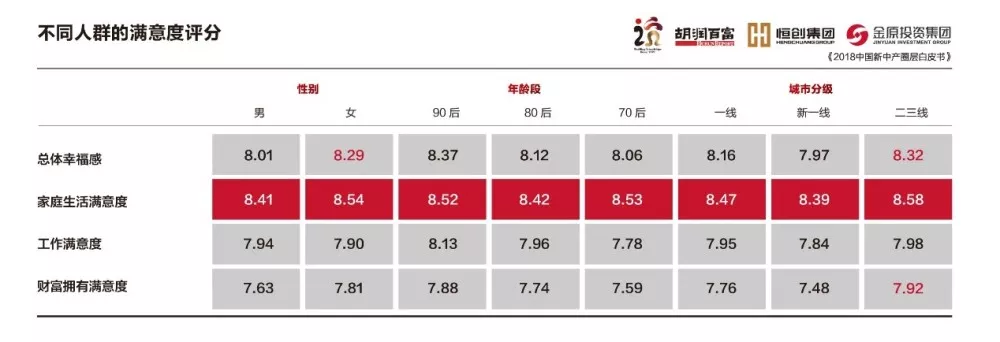 另外,生活在二三线城市的新中产人群幸福感明显高于其他城市。