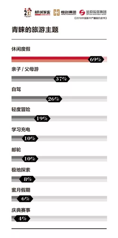 过去两年新中产人群中平均因私外出旅游5次,90后外出旅游频率最高,17%的90后过去两年旅游次数达到9次以上。在旅游的主题上,新中产人群以休闲度假游为主,占比69%,其次是亲子/父母游(37%)。