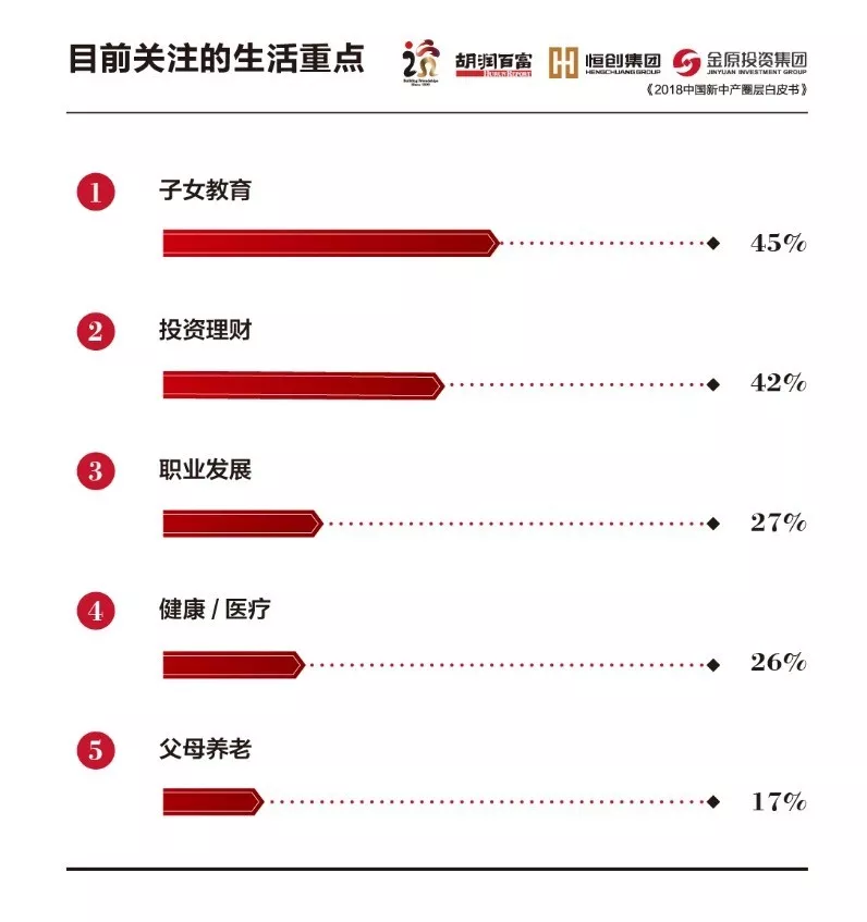 胡润表示:“中国大陆中产家庭数量已达3320万户,其中新中产1000万户以上。让我感到印象很深刻的研究发现是:一、新中产人群非常积极向上的精神面貌,无论是对工作还是家庭生活或是对自己个人精神层面的‘野心’都很大;二是对于家庭投资理财,他们明显表现出‘心有余而力不足’的焦虑情绪,日常对于投资理财关注程度仅次于子女教育。很高兴与国内领先的投资和资产管理公司金原投资联合发布《2018中国新中产圈层白皮书》,希望它可以有助于人们清晰地认识到谁是新中产,同时了解这部分具备较高消费能力和投资能力且快速增长的人群其方方面面的需求。”