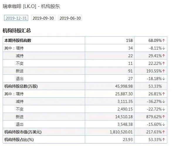 瑞幸机构投资人跨涉国际知名投行与对冲基金。Wind数据显示,截至2019年12月31日,共有158家机构投资者持有瑞幸咖啡股票,相较2019年第三季度末新增64家机构进入场,如今它们一律被埋坑底。明细一栏显示,截至2019年年底,12家持有瑞幸超过千万股股票的机构包括美国银行、瑞银等,以及Capital Research Global Investors(全球资本研究投资者基金)、LONE PINE CAPITAL LLC(孤松资本)等。